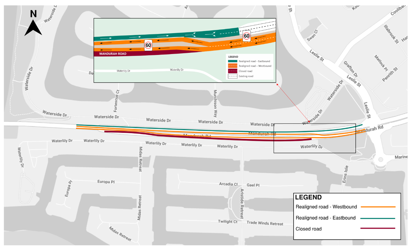 From 22 – 24 October 2025, 7pm to 5am, nightworks are required to set up the new alignment. A detour will be in place for eastbound traffic (towards Perth) with traffic diverted via Old Coast Road and Pinjarra Road.