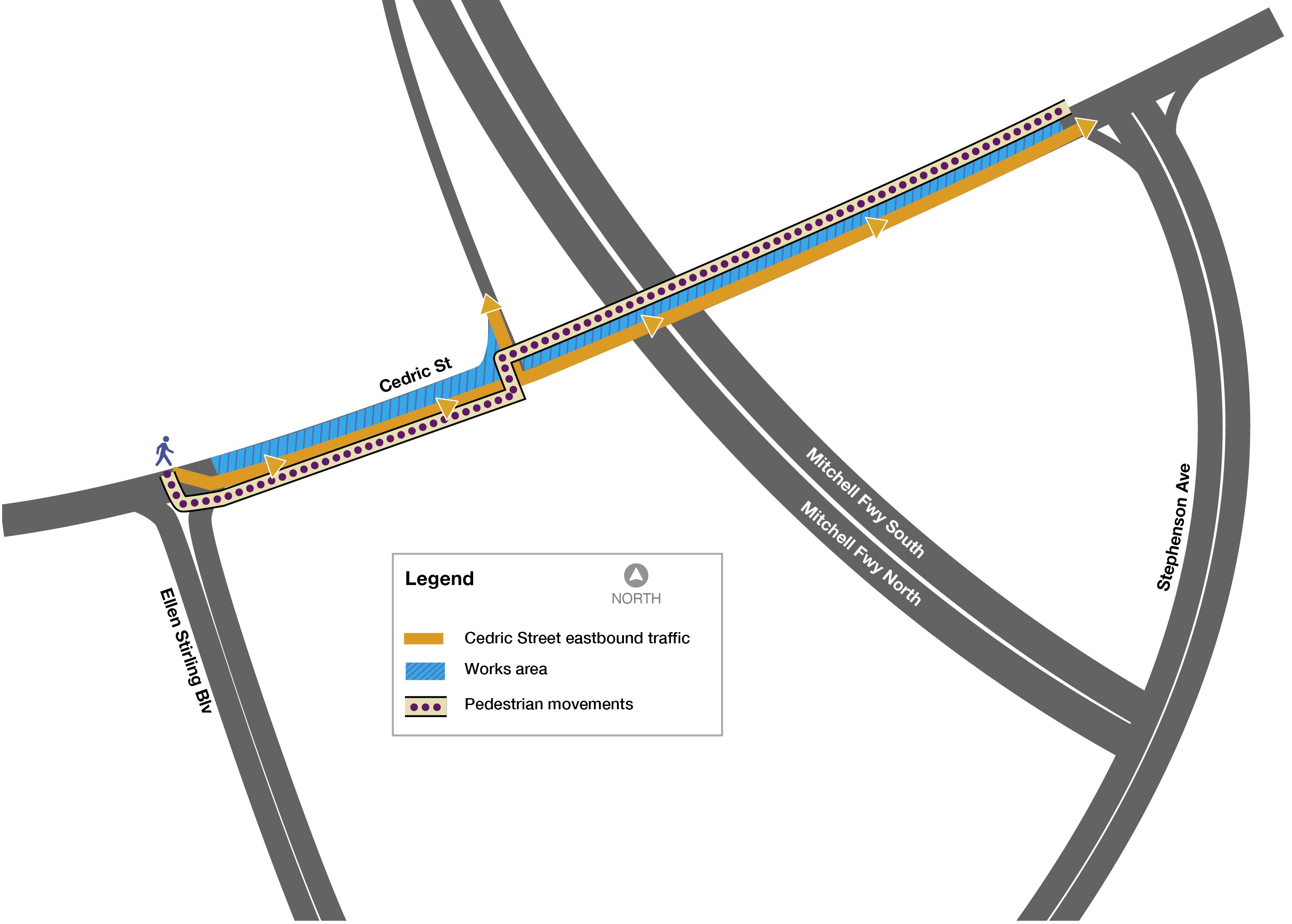 From Friday morning 27 February, Cedric Street eastbound traffic will be temporarily shifted between Ellen Stirling Boulevard and the Cedric Street northbound on-ramp.