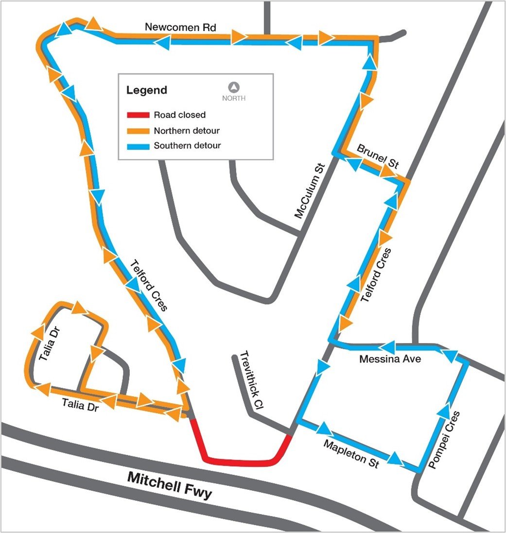 The footpath on the northern side of Cedric Street between Ellen Stirling Boulevard and the Cedric Street northbound on-ramp will be temporarily closed to progress construction works. During this time, pedestrians will be safely diverted to the southern side of the footpath. There will be wayfinding signage in place to guide pedestrians.