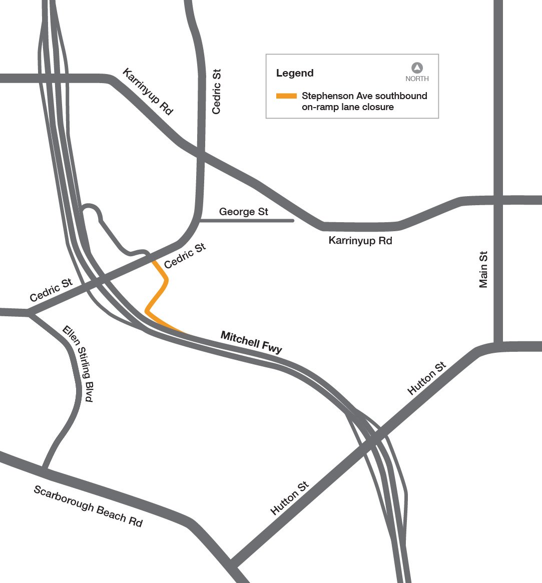 We are progressing key construction works to complete the future Stephenson Avenue southbound off-ramp. To enable the safe construction of the tie-in with Mitchell Freeway, we are required to close the Cedric Street southbound off-ramp ahead of the new off-ramp opening.
