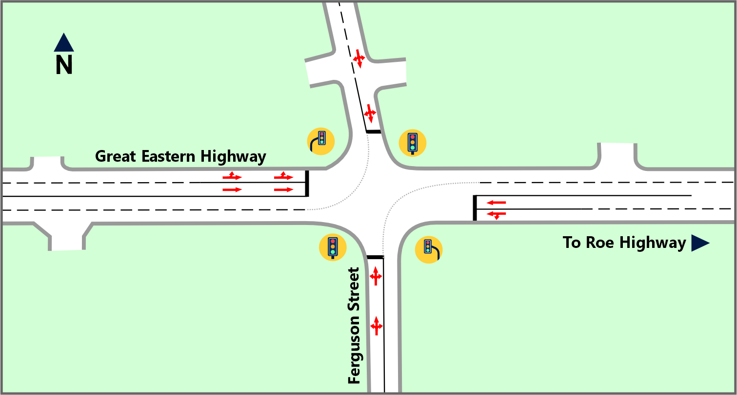 As part of this project, the Ferguson Street intersection will be modified to allow only straight through or left-turn movements on Great Eastern Highway. This will minimise congestion on the busy highway and reduce the risk of rear-end and right-turn crashes.