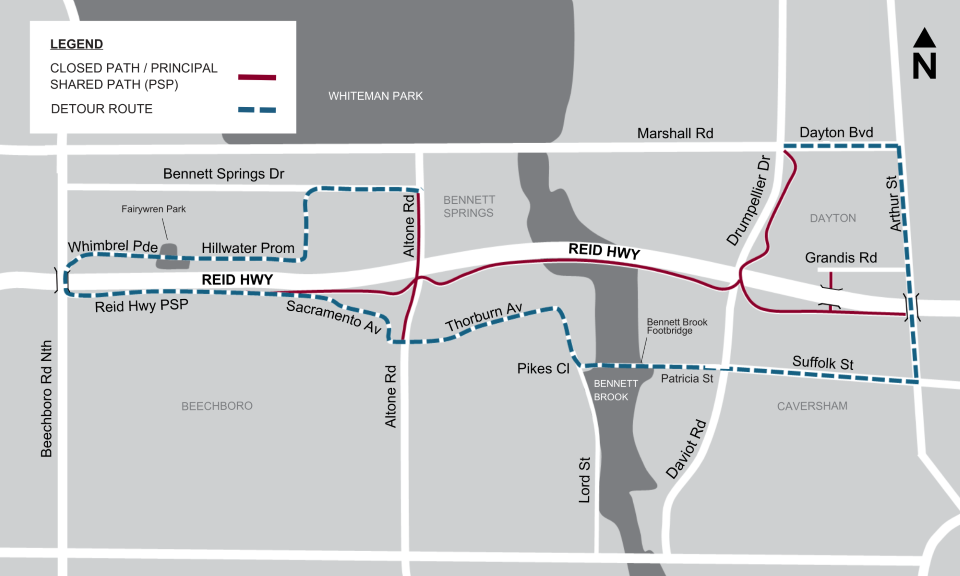 There is likely to be some changes and / or detours to the existing PSP along Reid Highway during the construction period. This will be considered by our Contractor in the development of their Traffic Management Plan, in consultation with path users, cycling groups and other key stakeholders.