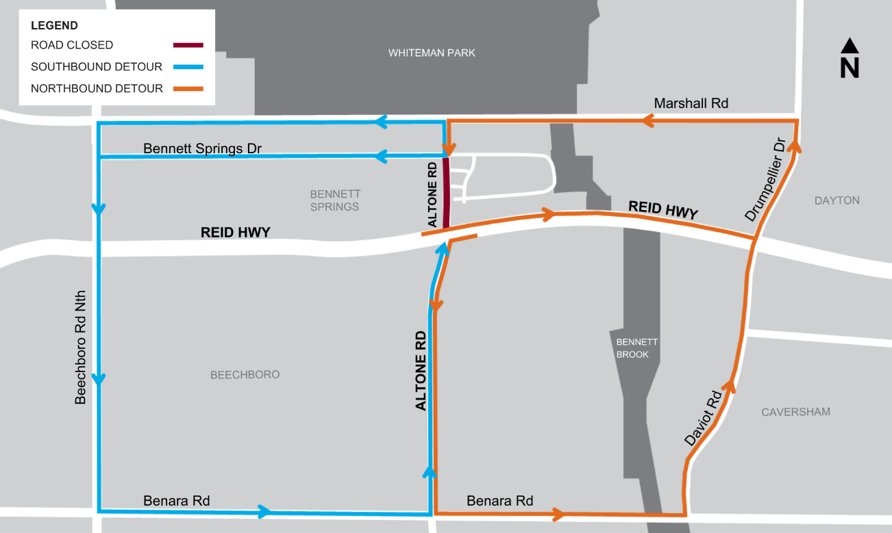 - A new bridge on Reid Highway, passing over Altone Road intersection, with connectivity between Altone Road and Reid Highway to be maintained via entry and exit ramps and roundabouts.
