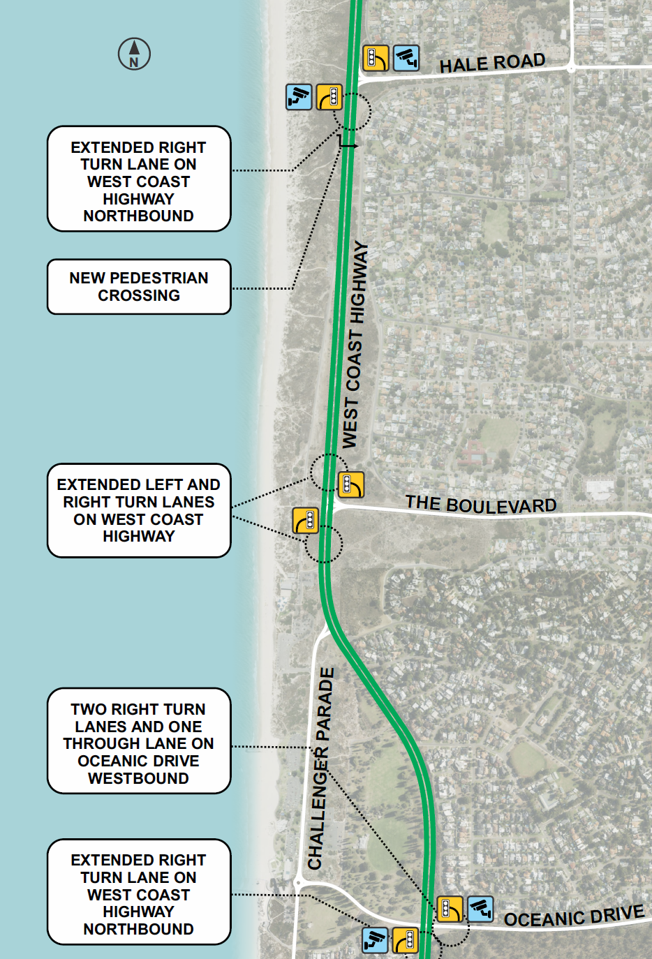 Work will start in June 2025 to upgrade West Coast Highway’s intersections with Oceanic Drive, The Boulevard and Hale Road.