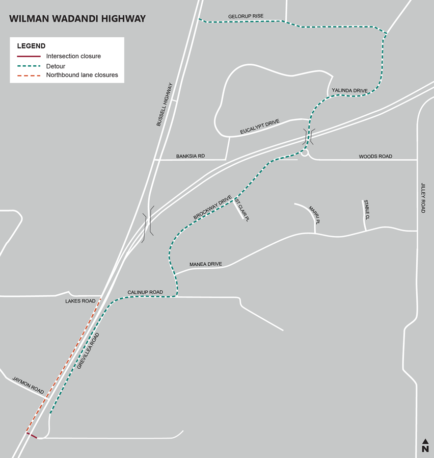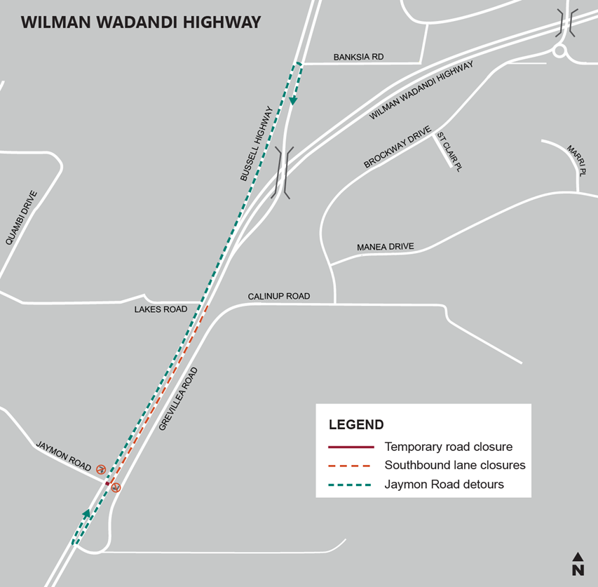 - Closure of the Bussell Highway/Jaymon Road intersection. Detours via Lakes Road.