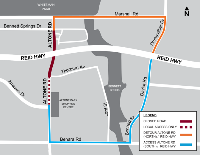- A new bridge on Reid Highway, passing over Altone Road intersection, with connectivity between Altone Road and Reid Highway to be maintained via entry and exit ramps and roundabouts.