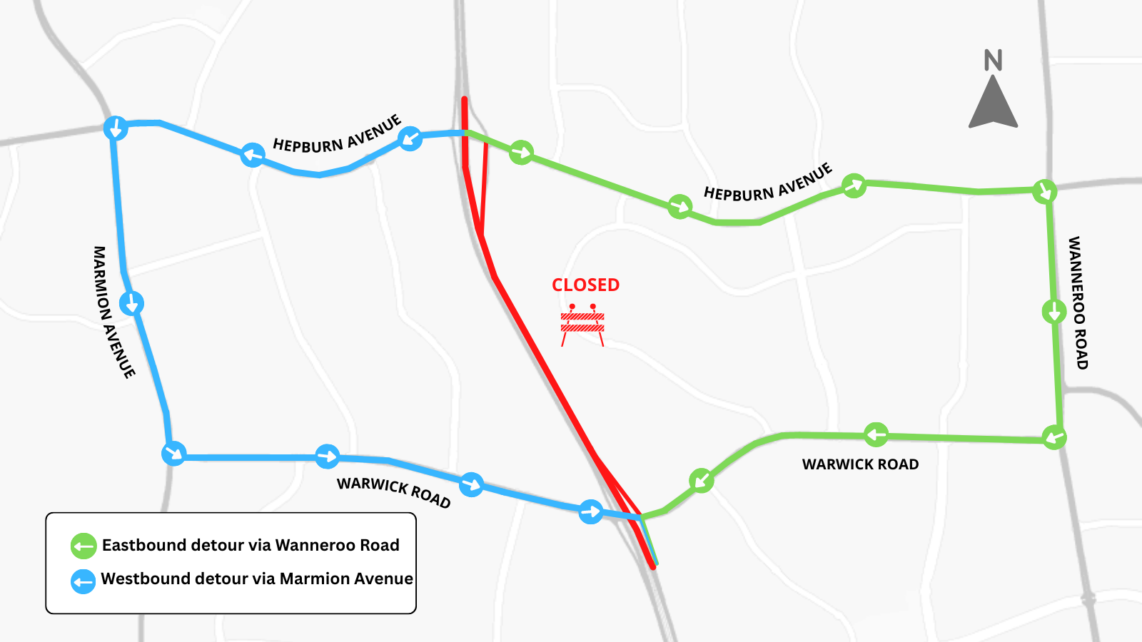 - Hepburn Avenue on-ramp and Warwick Road off-ramp close from 8pm.