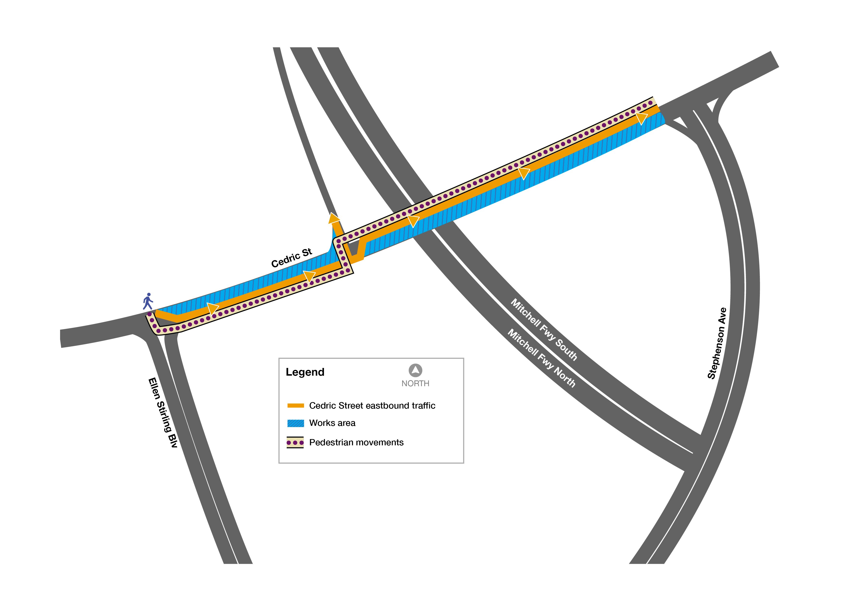 The footpath on the northern side of Cedric Street between Ellen Stirling Boulevard and the Cedric Street northbound on-ramp will be temporarily closed to progress construction works. During this time, pedestrians will be safely diverted to the southern side of the footpath. There will be wayfinding signage in place to guide pedestrians.