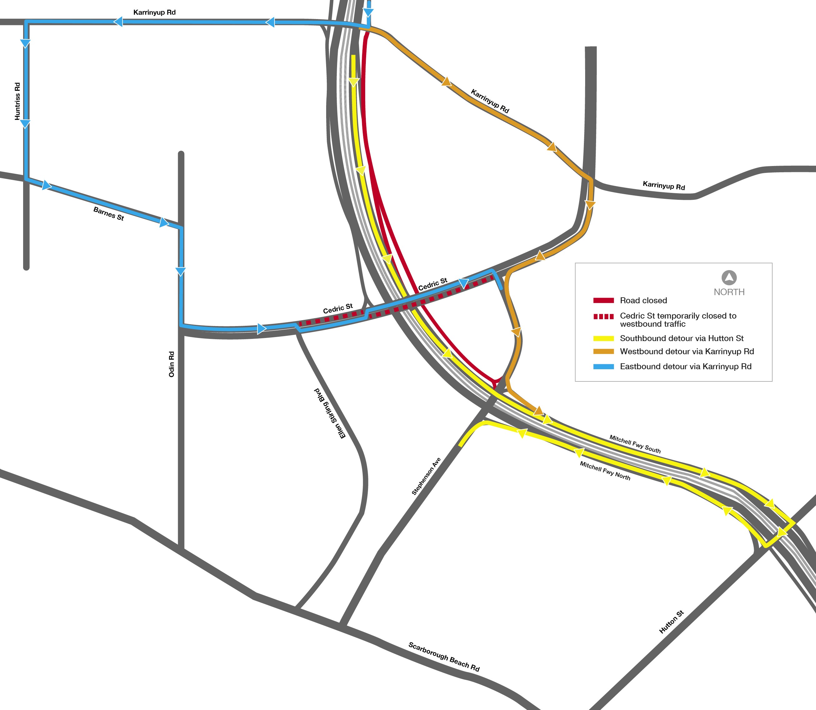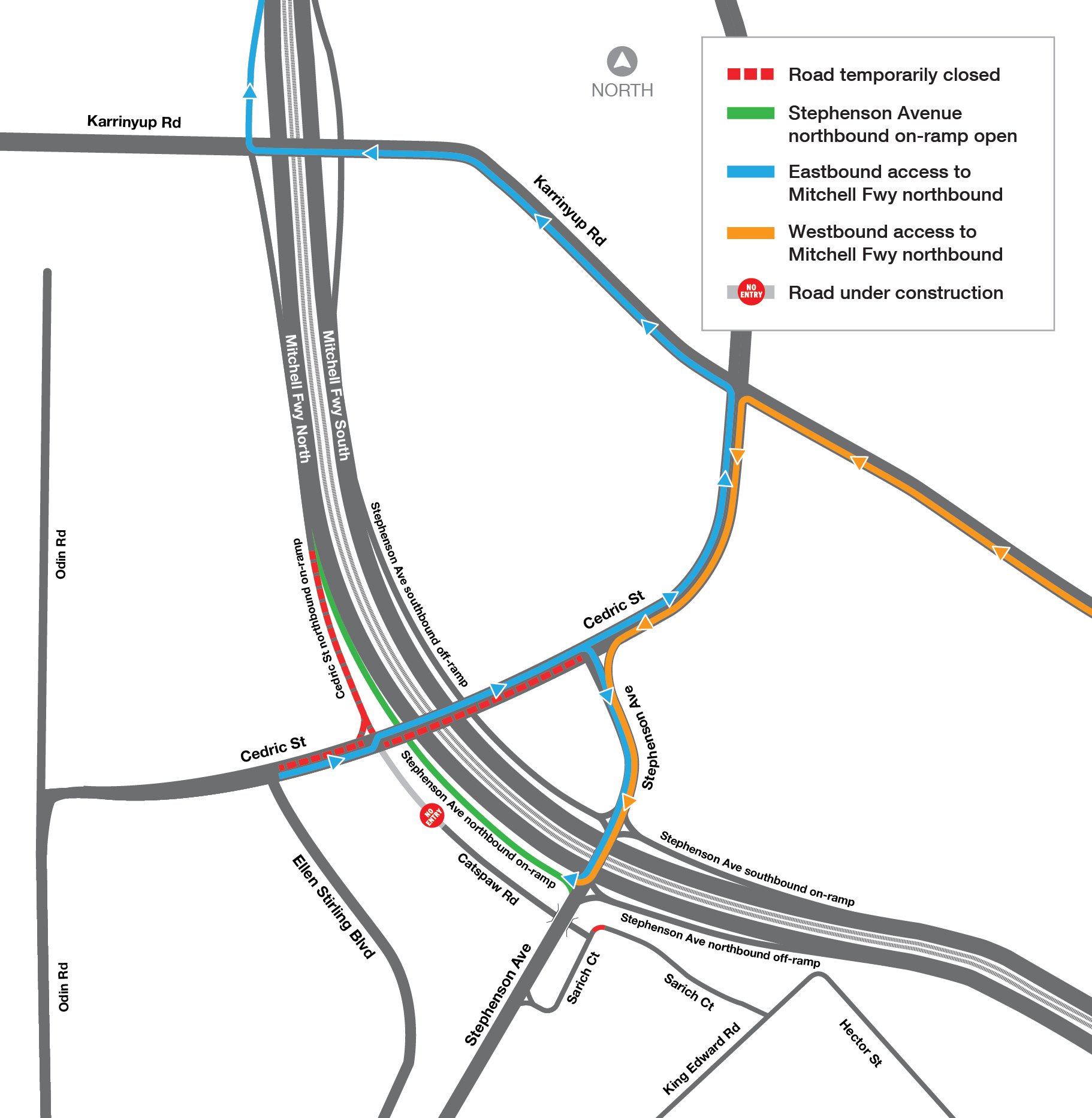 Detours will be in place via the new Stephenson Avenue northbound on ramp or the Karrinyup Road northbound on ramp – view map of new road layout below.