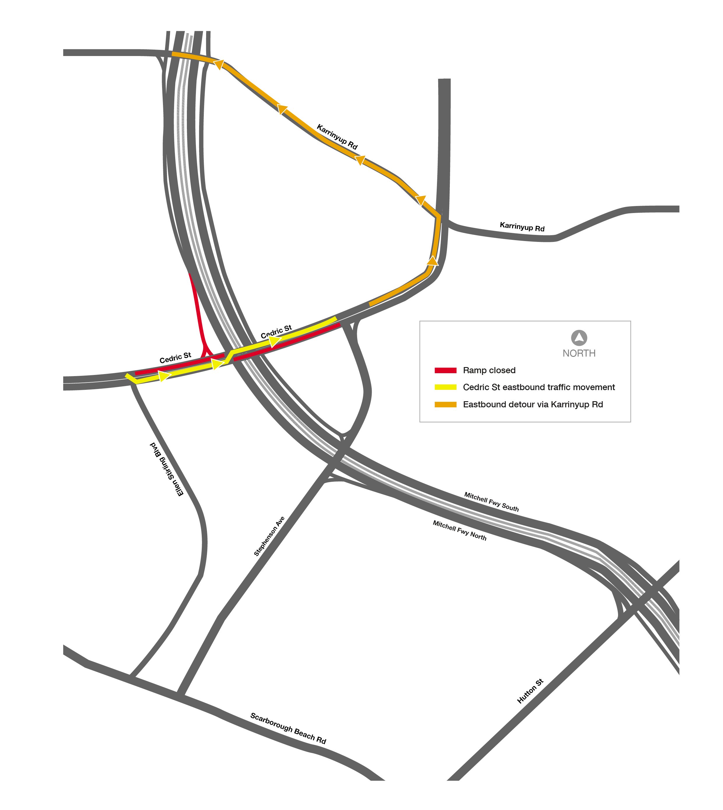- Coinciding with the opening of the final ramp, a temporary full closure of Cedric Street between Ellen Stirling Boulevard and Stephenson Avenue and the Cedric Street northbound on ramp will be implemented to complete finishing works. Buses will continue retain access along Cedric Street.
