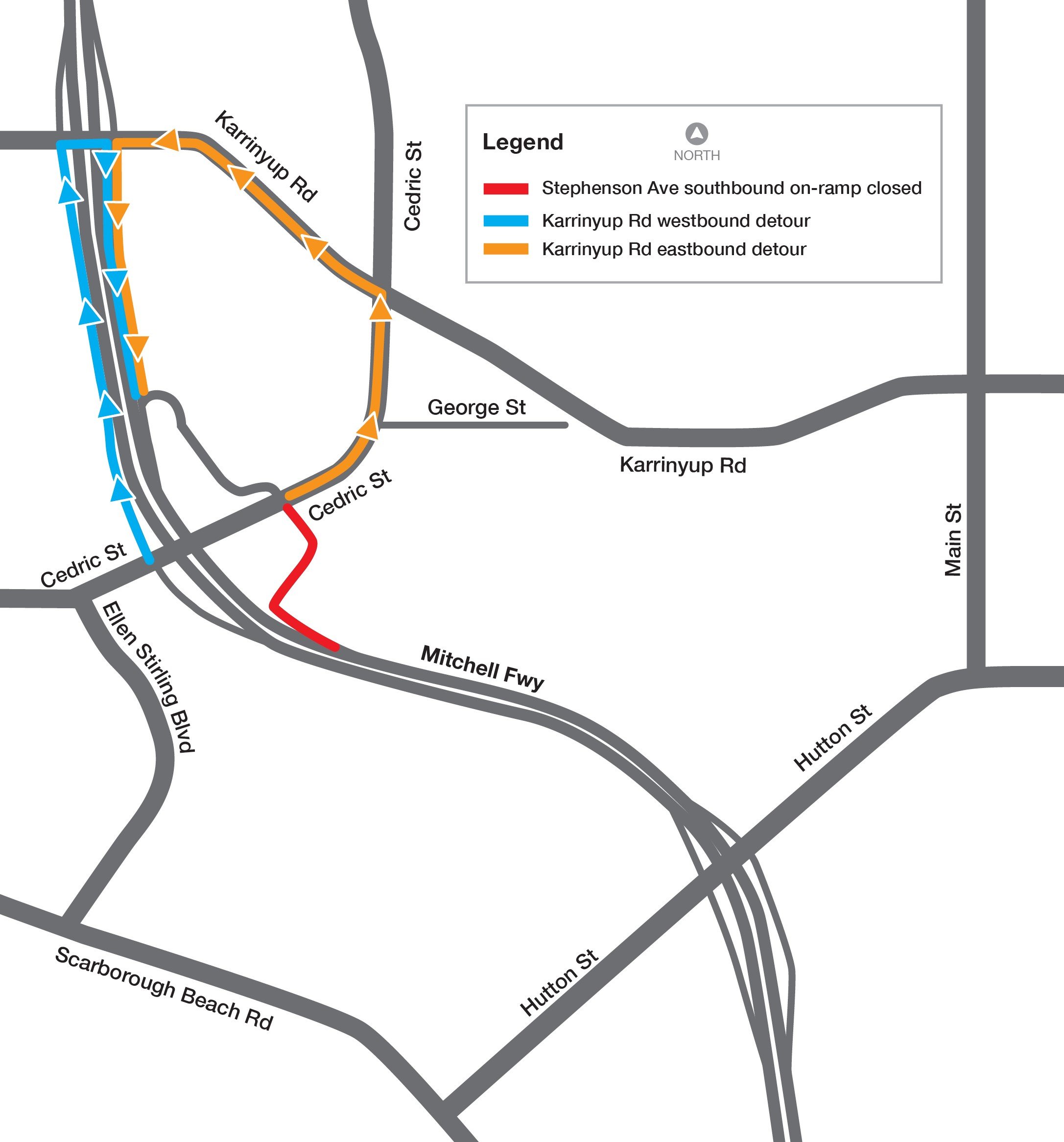 Access to Innaloo, Stirling and surrounding areas will temporarily be via the following alternative routes until the new Stephenson Avenue southbound off-ramp is operational: